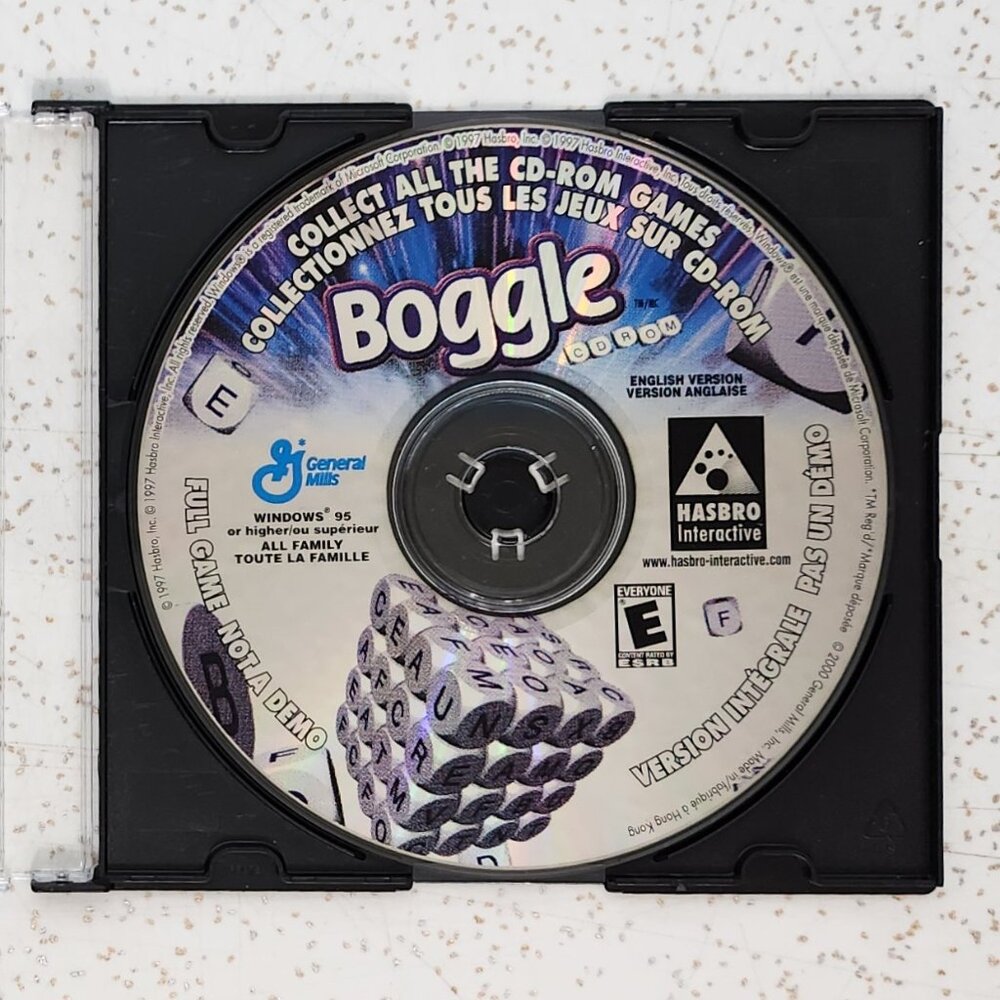 Vintage/Retro PC Game-Boggle. 1997. Hasbro. Microsoft. General Mills Cereal. Win 95 & HIgher. Great overall preloved condition, one small scratch. Game disc only.
