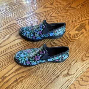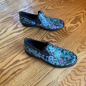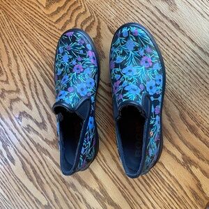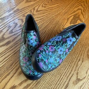 Waterproof garden shoes in a pretty blue/purple/green floral print. Side goring and a little rubber step on the heels makes them easy to take on/off. In excellent used condition. Only selling them because although they are identified as Size US9/EU40 they fit large and are too big for me (last photo shows overall length, about 11").