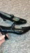 Sleek and stylish black heels. Perfect for any occasion. Made in Greece. I don’t know the material. There are a few scuffs in the shoes. See pictures for details. The heel is three inches. Nice button buckle closure.