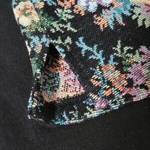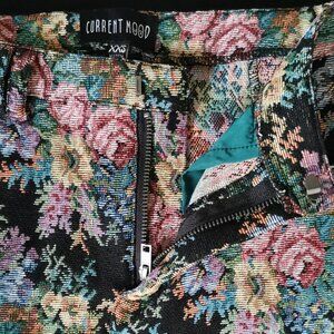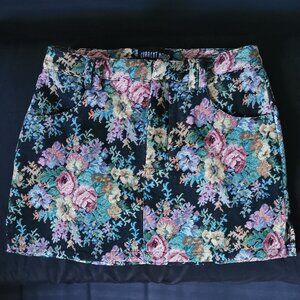 This mini skirt has a floral jacquard construction, front pockets, tiny side slits, belt loops, and a front hook and zipper closure.