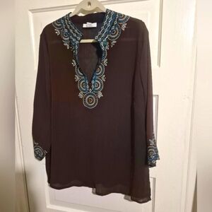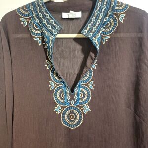 This stylish tunic from Dressbarn showcases a deep brown color enhanced by intricate blue embellishments around the neckline and cuffs. The long sleeves and flowing fabric provide a comfortable and elegant fit, perfect for adding a touch of sophistication to your wardrobe.