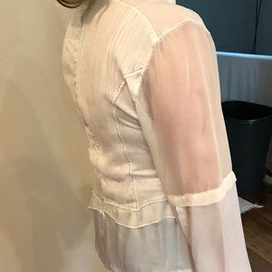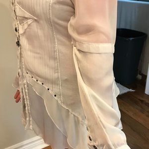 Uniquely Italian, silky and sheer, this fitted blouse can be dressed up or down. To the hip and meant to be worn 'over' bottoms, the silhouette accentuates the waist and elongates the body. It is very slimming. Fits small - Size XL