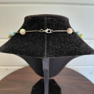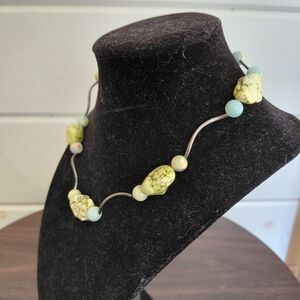 This stunning necklace features intricately carved green and blue beads, each adorned with delicate floral motifs. Strung on a sturdy cord, it embodies a natural, bohemian elegance that enhances any ensemble. Handmade and unique one of its kind.