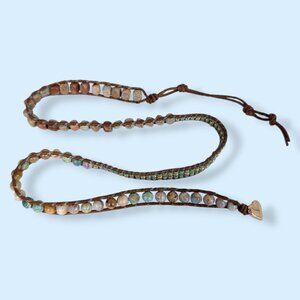This bracelet is made of brown leather cords and is long enough to wrap around the wrist multiple times. The bracelet is strung with colourful natural stones on either end and seed beads in the center. The stones appear to be jasper, and one end has polished spherical beads while the other has smooth, slightly rounded cubes. The bracelet has a button (heart) and loop closure with two options for length. The bracelet has some wear, but is very wearable and is very eye catching.