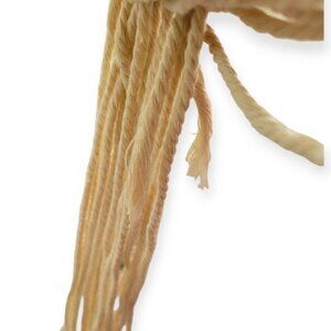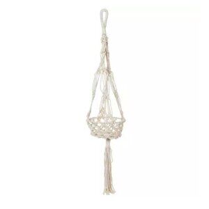 Enhance your space with this cream macrame hanging planter featuring a bohemian design.