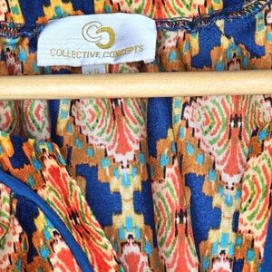 Stylish bohemian blouse with intricate patterns. Features a mix of navy, gold, and cream colors.