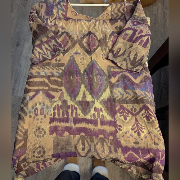 Stylish bohemian blouse with a vibrant pattern. Features shades of purple and tan.