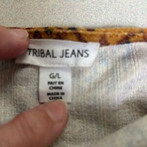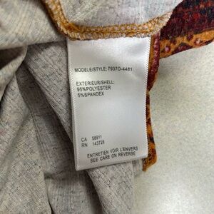 Stylish bohemian dress with a vibrant pattern features a mix of orange and brown tones with covered buttons. This dress is stretchy, generously sized, swingy and has a nice drape. Looks awesome with brown boots. Bought from a BC Ferries boutique.