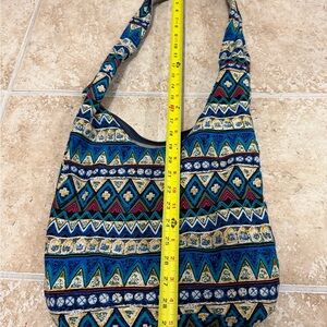 This stylish bohemian shoulder bag features a vibrant mix of blue, green, and gold patterns. Perfect for adding a pop of color to any outfit.