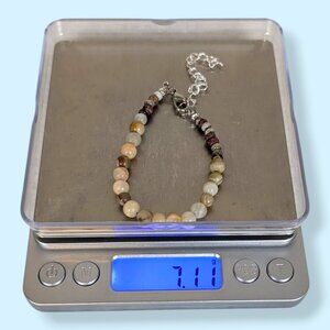 This bohemian bracelet is beaded and has an adjustable lobster claw closure made of a silver tone metal. The bracelet is strung with 2 types of beads: small red and white tone seed beads (near the clasp), and larger polished spherical beads made of natural stone that are cool to the touch and have a nice weight. I'm not 100% sure of the bead materials, but agate feels like a safe bet for a few of them.
