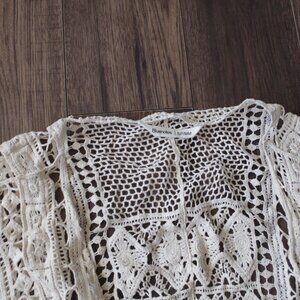 Bohemian style fringe open cream cardigan crotchet ,in good condition ,pit to pit is 28 inches across ,length is 25 inches long .size is small to medium.This is 100% cotton from Blue Notes.