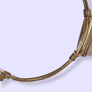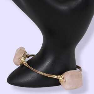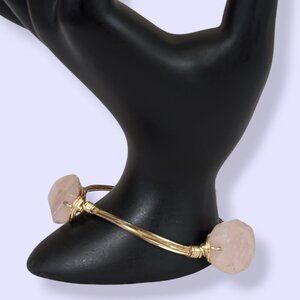 This bohemian bracelet is made of a gold tone metal and is a fixed size. There are 3 smooth, but oddly shaped pink quartz stones affixed to the bangle, wrapped with wire. The bracelet has normal wear and there is some tone loss on the metal wire inside the piece.