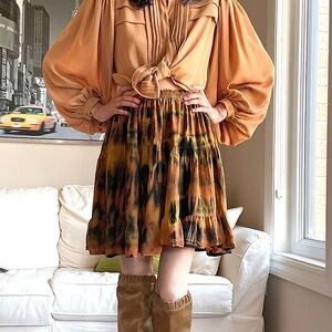 Rust/black. Elastic waist. Can fit up to Medium(see measurements). Model is size small, 5’9. Rayon. Approx 20.5in length, 11in width at waistband unstretched(25in fully stretched), Hem a little uneven(see last pic)