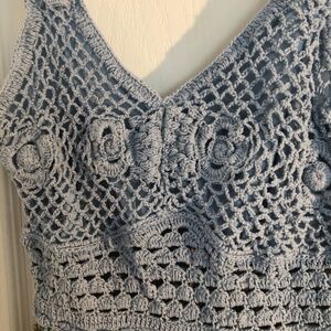 Periwinkle Crochet Top Jumpsuit by Band of Gypsies with Flower Power 70"s Vibe pattern pants PTP 15-19” inseam 30.5”