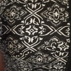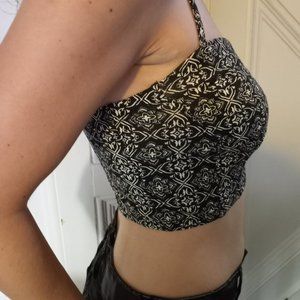 Black and White boho patterned crop top with hook and eye closured with adjustable straps. There is some stretch to the fabric. Smocked back. Very flattering on.