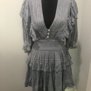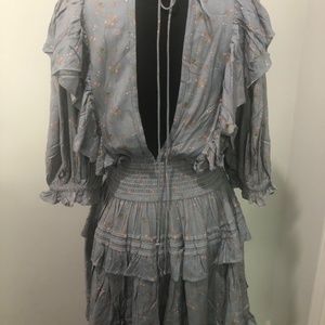On trend for 2024 with smocking at waist low cut and open back dress. Periwinkle with pink flowers. This is a reposh PTP 19” Length 33” size small but fits medium