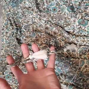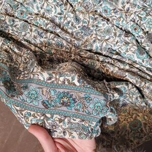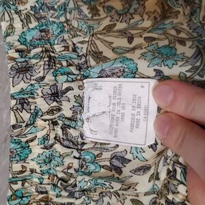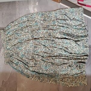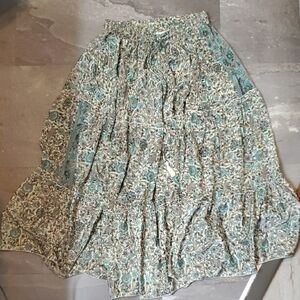 Boho Floral Print Tiered Women's Skirt. Looks like a faint yellow/cream). Green, brown. Gold touch. Fabric is lightweight, flowy and feels like satin. Elastic waistband with adjustable cord. Made in India. 31" long. No size tag but fits like a size S, see pictures for measurements. Excellent condition. No stain, no rip. Non smoking house.