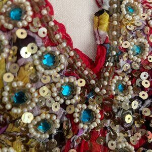 Boho Floral Sheer Tunic Dress with Sequin Beaded Neckline size Small
