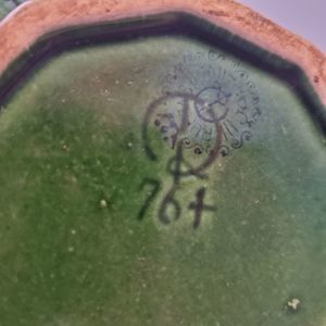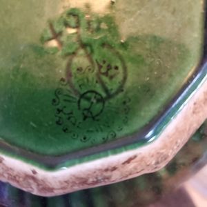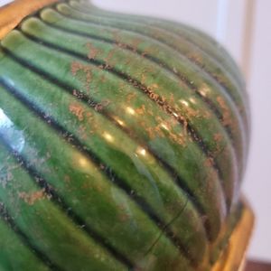 Beautiful green with gold splatter and rim, this Vintage flower pot is the perfect addition to any kitchen, office or living space! Because of its age we suggest indoor use only to preserve this piece for many more years!