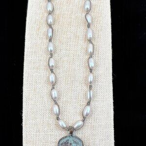 Fresh water pearl knotted necklace with a patina pendant. The clasp and ring are sterling silver. The necklace measures 30" long. The pearls are a beautiful soft grey.
