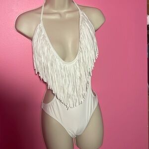 Boho Fringe Deep V One-Piece Swimsuit – Halter Cutout – White – Size Medium