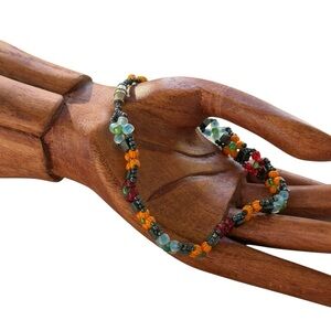 Add a playful pop of color to your ankle with this handcrafted boho-style bracelet. Featuring a mix of orange, green, red, black, and translucent blue beads arranged in a lively pattern, this piece brings joyful energy and artisan charm to any outfit.