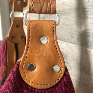 This handcrafted tote bag features a vibrant multicolor design, perfect for adding a unique touch to any outfit. The rich red and brown tones are complemented by intricate patterns, making it a standout accessory. It has some signs of wear but a lot of life left in this stunning bag.