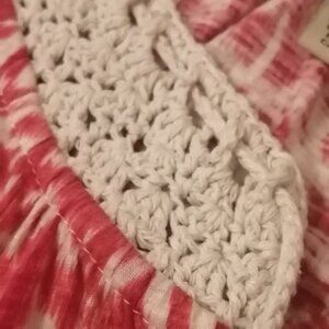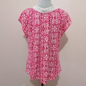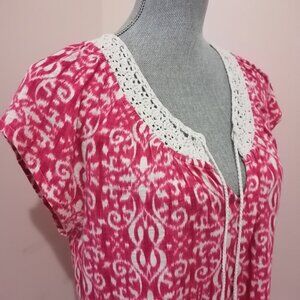 This listing is for a cute boho style shirt made by Lucky Brand. The hot pink and natural/off-white/cream coloured pattern of this top looks a bit like hearts, flowers, and swirls. The scoop neckline features crocheted lace with a drawstring; both the lace and drawstring are made in a natural/cream tone that matches with the colour in the body and cap sleeves. The drawstrings each have a single brown wooden bead on them. Please excuse the different lighting on the detail shots!