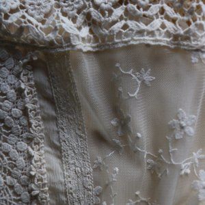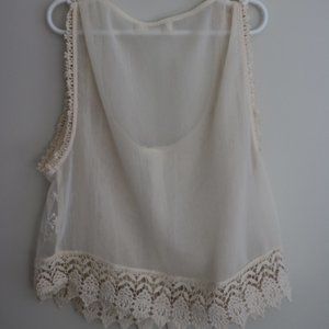 Boho lace summer top, beautiful detail work all around. Light and airy. Can be worn buttoned down or open for a vest-like style!