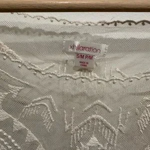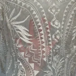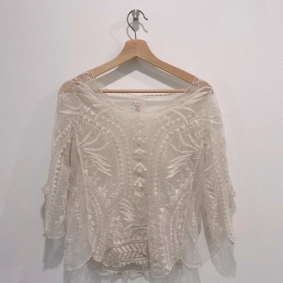 Great condition! See through embroidered lace fabric. 3/4 length sleeve. Super cute with a cami underneath and jeans/shorts.