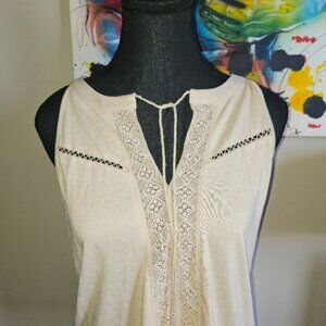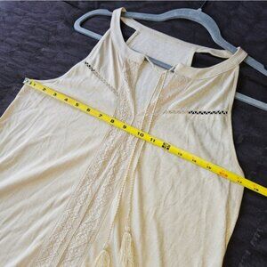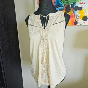 Soft, airy, and beautifully detailed — this boho racerback tank features a lace-inset front panel, delicate openwork trim, and tassel ties at the neckline. Flowy woven fabric drapes effortlessly, and the racerback cut gives it a flattering, easy fit. Seller removed the original brand tag for comfort, so the brand is unknown — but the style is consistent with Free People / Urban Outfitters boho designs.