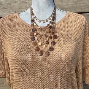 Multi-strand necklace featuring cascading natural shell discs in warm earthy tones on delicate gold-tone chains.