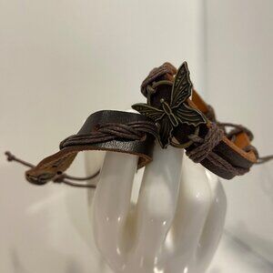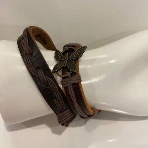 Boho Leather & Cord Butterfly Charm 2 set Bracelets genuine leather brown