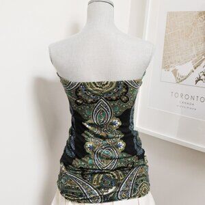 Early 2010s f21 bohemian scarf sleeveless top in shades of black, blue, green and yellow - perfect for summer. Longer length