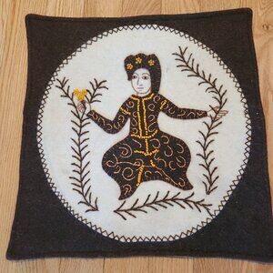 Felt pillow case with beaded Indian God. Perfect for your Boho room decor or an accent in your yoga space. Unused with original tags. The felt tends to cumulate dust so be warned. No tears. Tiny stain on the right side of his face. I think its part of the brown dye. Not sure if it will come out!! As Is!!