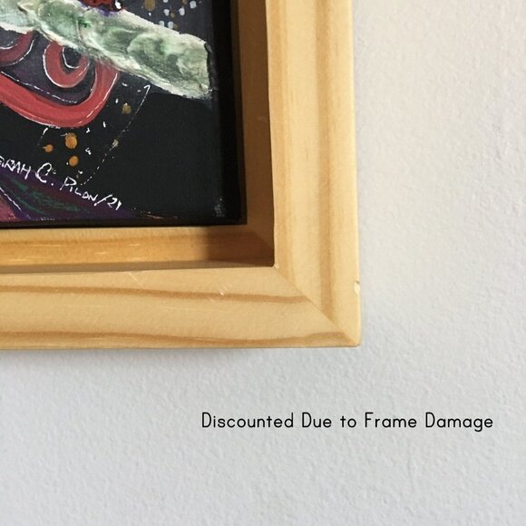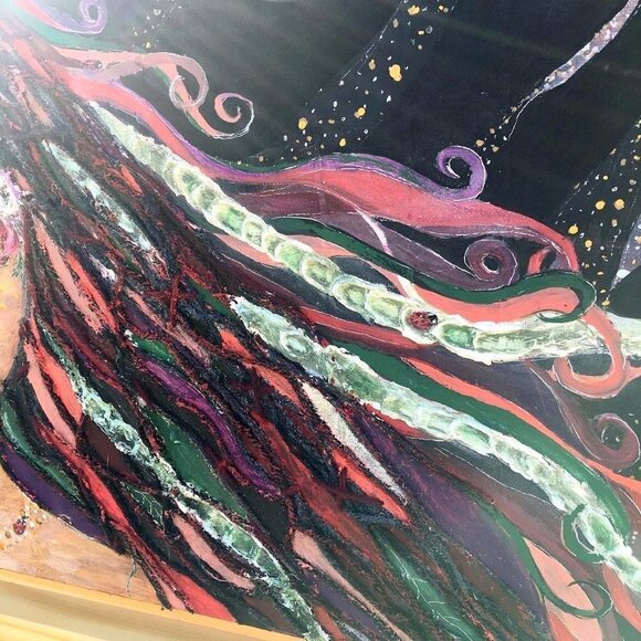 A divine goddess intermingling with the magic of nature creates this one-of-a-kind painting. This piece is a textural delight thanks to thick flows of paint and flowers embroidered directly into the canvas. Zoom in closer and you will find golden stars sweeping across the sky, cheeks, and neckline. You will also notice some lucky ladybugs crawling about. Can you find all 7?