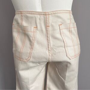 Mid/high-rise, flat front, flared, wide leg pants with 2 back pockets. Material is a cotton canvas. No tags, looks professionally handmade.