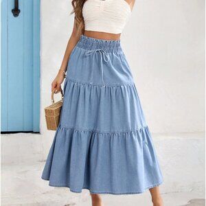 Boho Ruffle Hem Shirred Waist Denim Midi Skirt