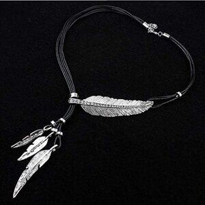 Boho Silver Feather Pendant Necklace Vintage Statement Jewelry for Women