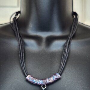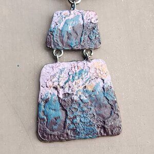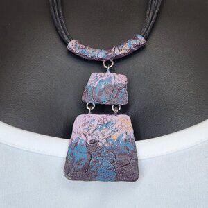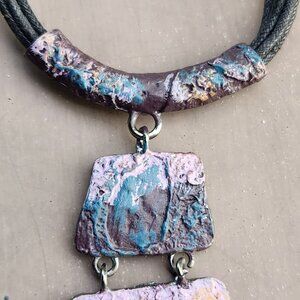 Make a bold artistic statement with this handcrafted necklace featuring a striking three-piece painted metal pendant. The geometric, layered pendant showcases a textured abstract design in shades of deep purple, soft pink, sky blue, and hints of ochre—resembling a moody landscape or modern art canvas. The pendant hangs from multiple strands of black cord, creating a chic contrast and comfortable fit.