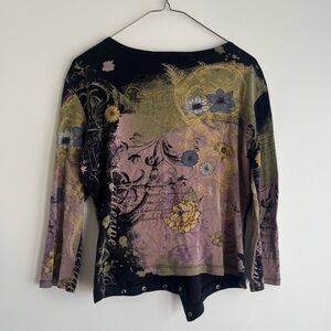 Vintage Boho Chic Tee. Size tag says L but could fit a size small to Large. 3/4 length sleeves, 100% cotton, studded hardware details.