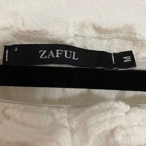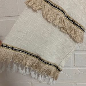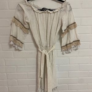 Off-white coverup (or dress) - it’s see-through. Cute tassels and detailing on the bell sleeves and at the bottom. Tie around the waist.