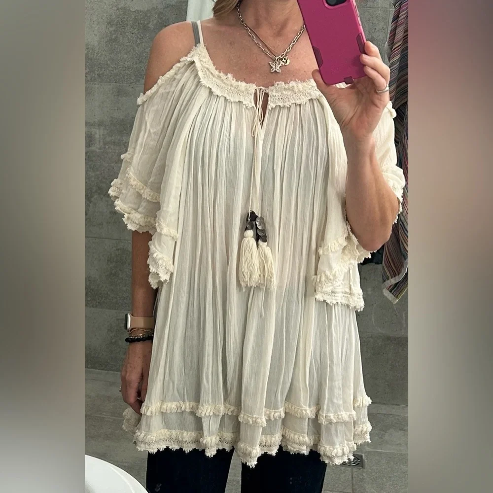 Super pretty flowy Raga top in cream. Open shoulder and wide bell sleeves. Gorgeous detail and trim. Size small but is pretty generous and would fit a medium also. Bought for around 250$. In excellent condition. 100% viscose