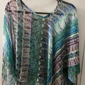 Boho style Multi-coloured Scarf Poncho adds free-spirited fun to any outfit, and turns plain into posh. Measures 45" wide from end to end and 19" from collar to bottom.
