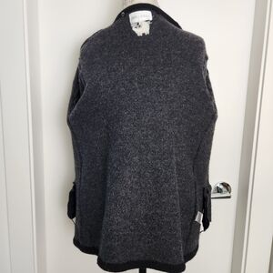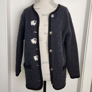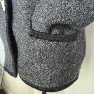 Vintage 80s, pre-shrunk 100% Wool, hollow Silver metal Floral embossed Buttons, Black Ribbed Trim, Austrian, German, Bavarian, Jardigan, Shacket, Coatigan, Excellent Vintage Condition, Size M, Pit-20, Sleeve-22, Length-25.