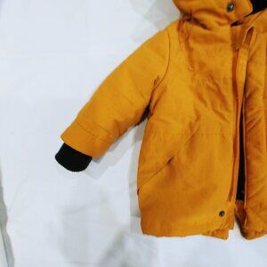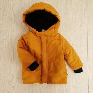A mustard yellow fleece-lined jacket by Boite à Malice features concealed pockets on the front, a full zip and snap closure, and ribbed contrasting cuffs. At the back, there is a small single vent that adds a touch of style and allows for ease of movement.