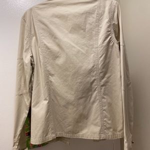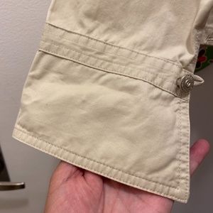 How pretty is this shirt? Can also be worn as a jacket if you wish. Beige with eyelet, and diamonds... so pretty! 100% Cotton and machine washable in warm water, tumble dry and NO bleach. Perfect with jeans or capri’s with light tank top underneath would look so cute!