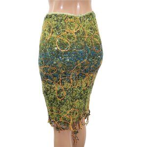 Crafted in an intricate open-weave knit, this skirt features a vibrant mix of moss green, deep blue, and sunset orange intertwined in an organic, deconstructed pattern. The raw, hand-finished edges and asymmetrical texture create a striking, earthy aesthetic perfect for the fashion-forward dresser.