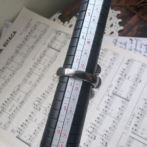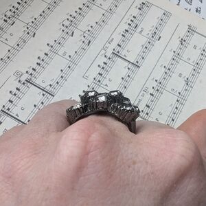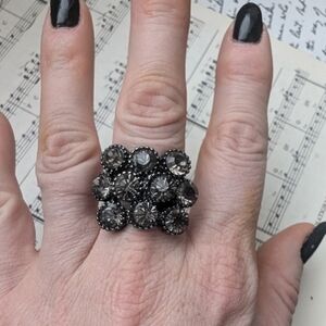 This striking black ring features a dramatic cluster design, with dark stones creating a sophisticated and edgy look. Its substantial size and three-dimensional structure make it a standout piece, perfect for adding a touch of bold elegance to any ensemble.