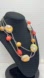 Featuring a mix of glossy orange, mustard yellow, and earth-toned glass beads, it's layered with delicate translucent strands for a bold yet elegant look. Each bead has its own unique swirl pattern, giving this piece a natural, artisanal vibe.